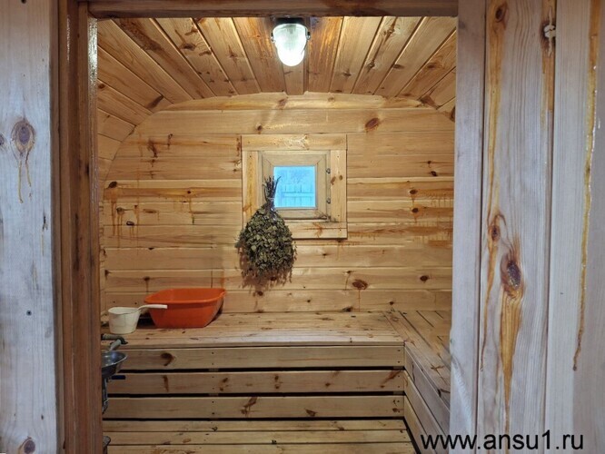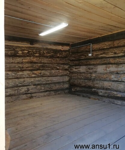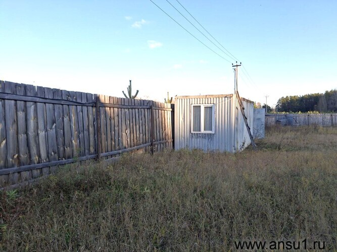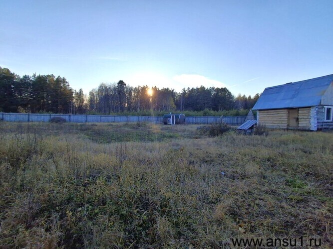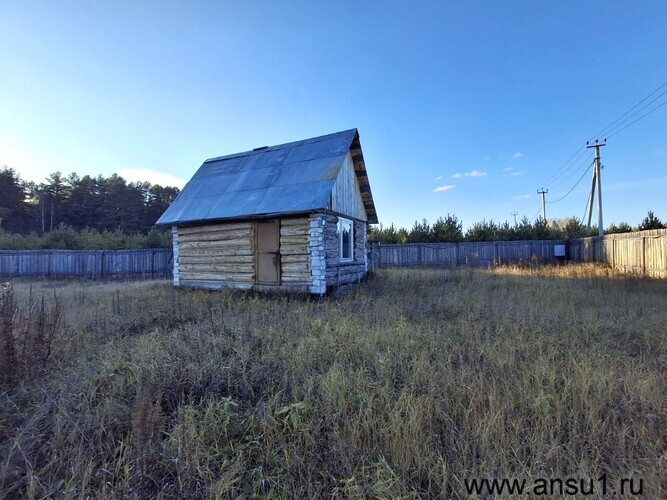 На участке стоит небольшой бревенчатый домик без отделки (18 м², 2017 год постройки), банька на дровах и бытовка – всё простое, но пригодное для отдыха и хозяйства.